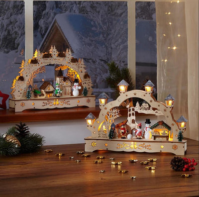 Mit der KLEINEN SCHWIBBOGENLANDSCHAFT bringen Sie den Zauber von Weihnachten in jede Ecke Ihres Zuhauses.Dank praktischem Batteriebetrieb benötigen Sie keinen Stromanschluss. Die warmen LEDs erstrahlen auf Knopfdruck und beleuchten den wunderschönen Bogen – mit kleinen Laternen oder fein gefrästen Häuser.